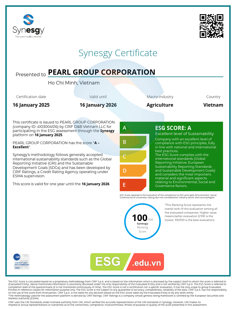 ESG Education & Business tự hào thông báo thành công trong việc hỗ trợ Tập đoàn Nông nghiệp Trân Châu (Pearl Group Corporation) trở thành tập đoàn nông nghiệp đầu tiên tại Việt Nam đạt chứng nhận phát triển bền vững Level A (Excellent Level of Sustainability) theo tiêu chuẩn GRI, được chứng nhận bởi CRIF International và giám sát bởi ESMA (Cơ quan Quản lý Thị trường và Chứng khoán Châu Âu).