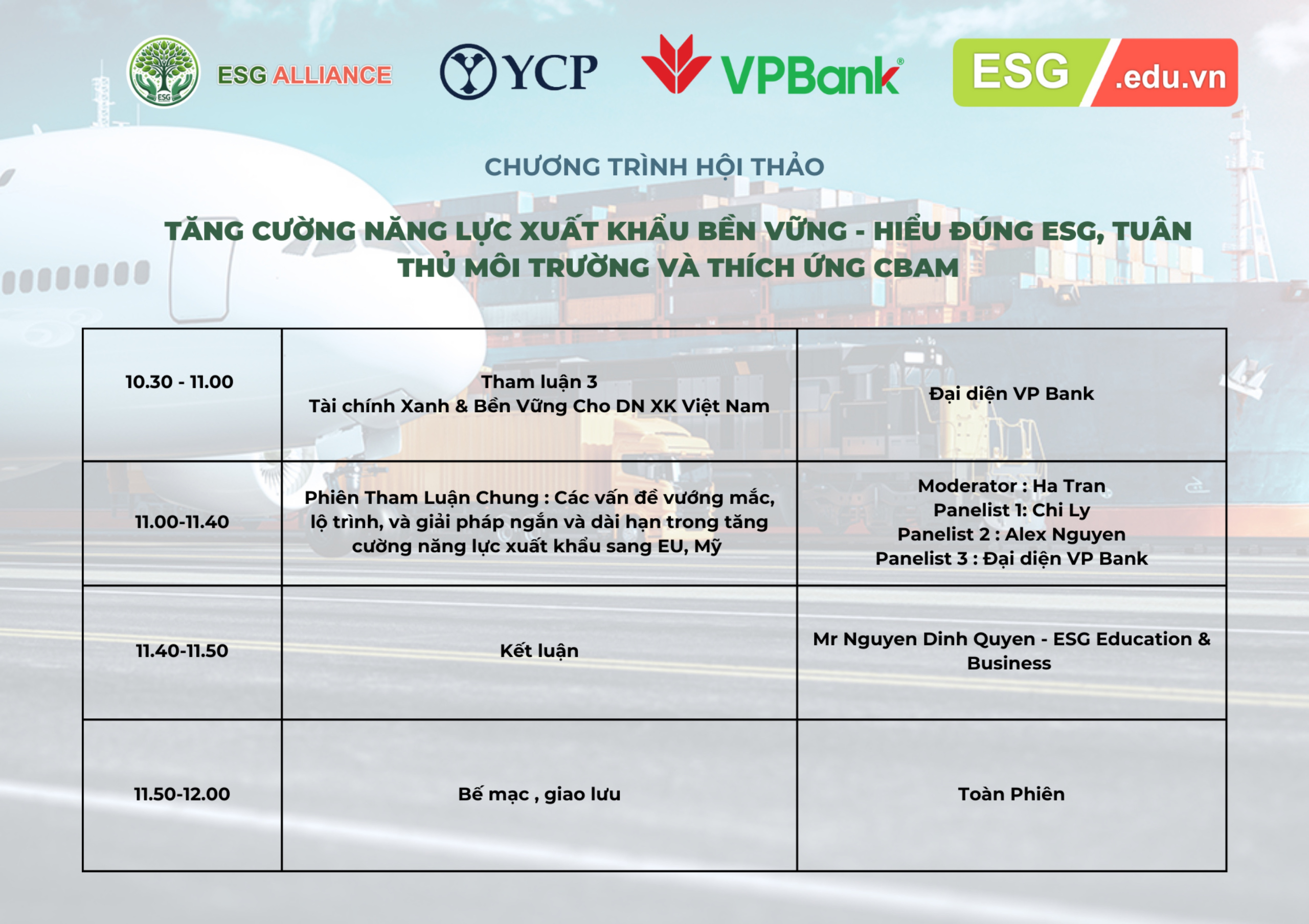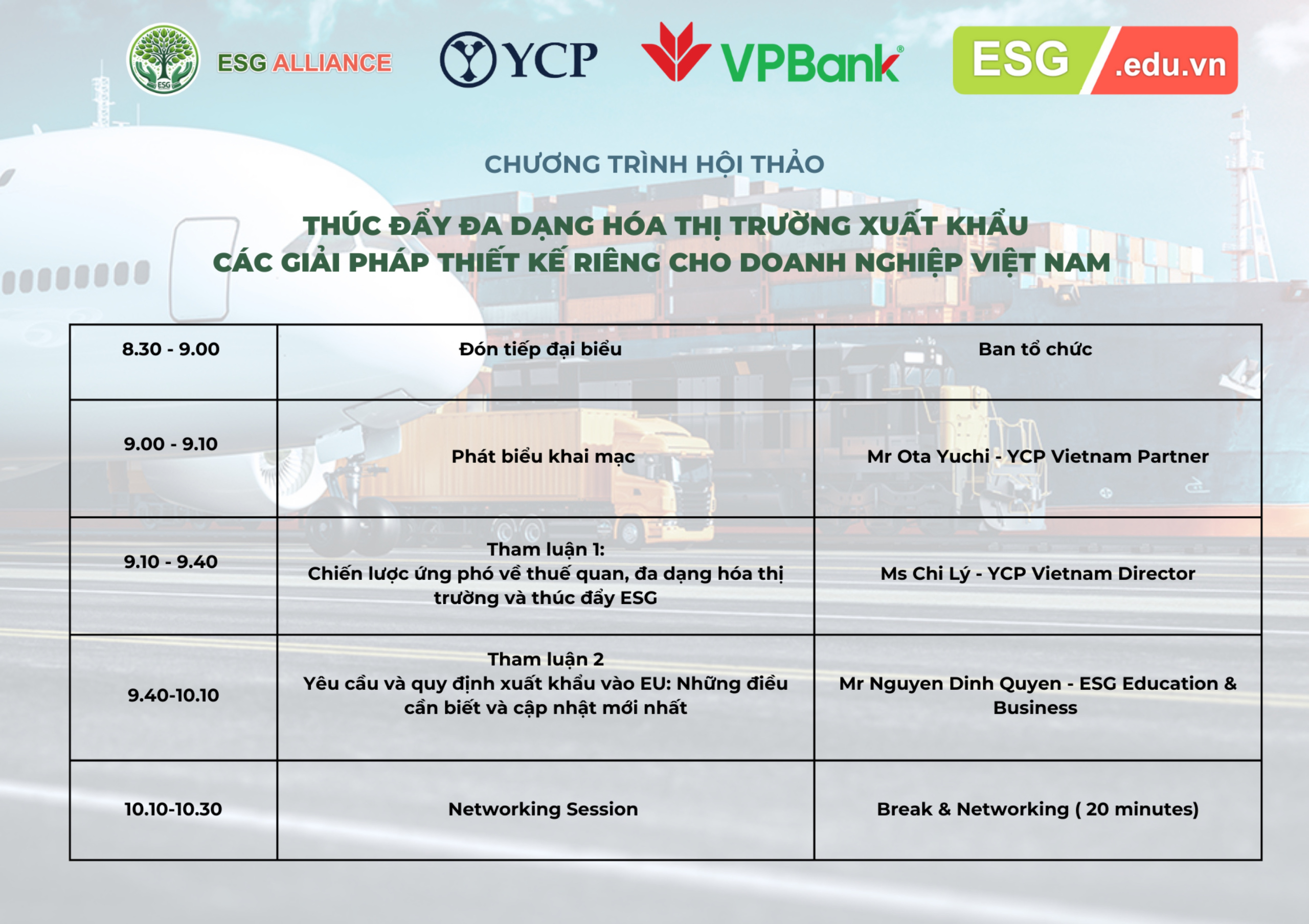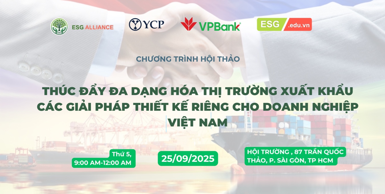 Hội thảo này do các chuyên gia quốc tế từ YCP Group phối hợp cùng ESG Education & Business và Liên Minh ESG & Sustainability Alliance tổ chức, nhằm cung cấp những giải pháp mới nhất nhằm hỗ trợ cho các doanh nghiệp trong việc đa dạng hóa thị trường từ tài chính, kỹ thuật cho đến chuỗi cung ứng.